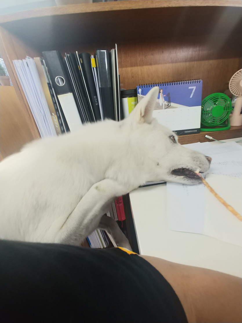 간식 앞에서 참을성이 강한 아이인데... 어느 순간 내 책상을 급습했다. 덩치가 커서 웬만한 간식은 한 입이지만, 네추러스 껌은 그나마 오래 먹는 편. 대형견주들 알아두세요~