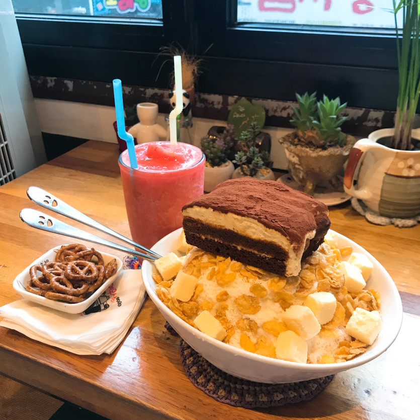 연대생이라면 입학 후 한 달 안에 한 번씩은 가보게 되는 마음의 고향! 빙수와 음료 메뉴가 으마으마하게 혜자롭습니다. 맛과 분위기 양까지 다 잡은, 프랜차이즈 카페 다 이기는 카페